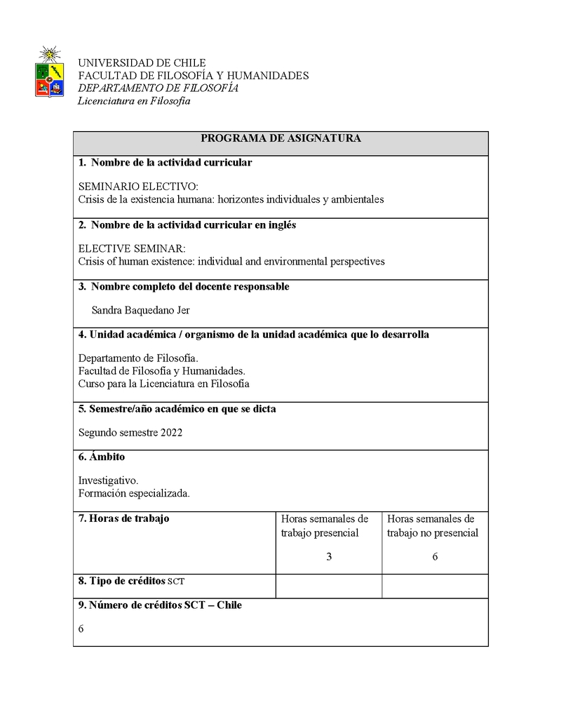FILS161-1 Seminario Electivo: Crisis de la existencia humana: horizontes individuales y ambientales 2022, Segundo Semestre