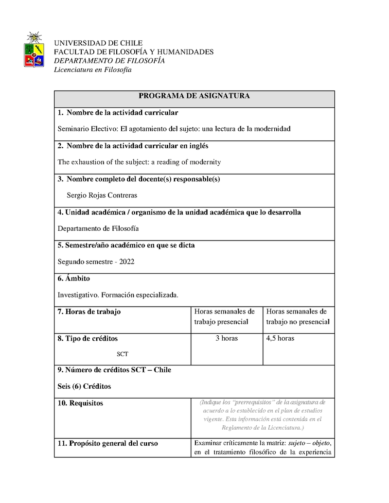 FILS167-1 Seminario Electivo: El agotamiento del sujeto: una lectura de la modernidad 2022, Segundo Semestre