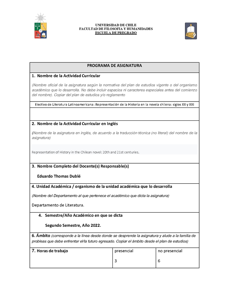 HISPLL065-1 Representación de la historia en la novela chilena siglos XX y XXI 2022, Segundo Semestre