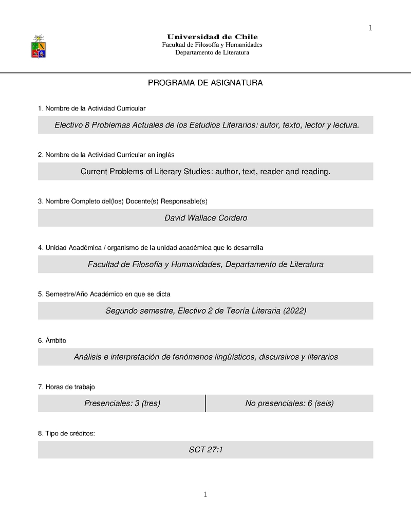 HISPTL025-1 Problemas Actuales de los Estudios Literarios: Autor, Texto, Lector 2022, Segundo Semestre