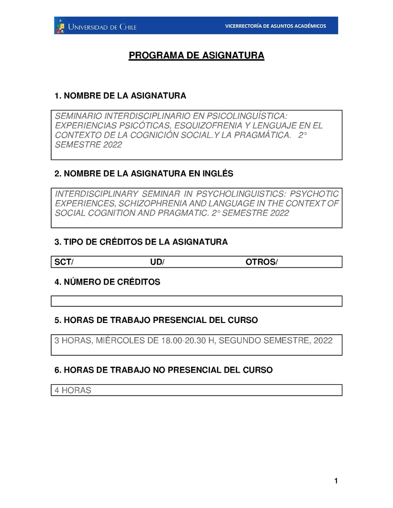 PS-FH150466-1 Seminario Interdisciplinario en Psicolingüística: Experiencias psicóticas, esquizofrenia y lenguaje en el contexto de la cognición social. Y la pragmática 2022, Segundo Semestre