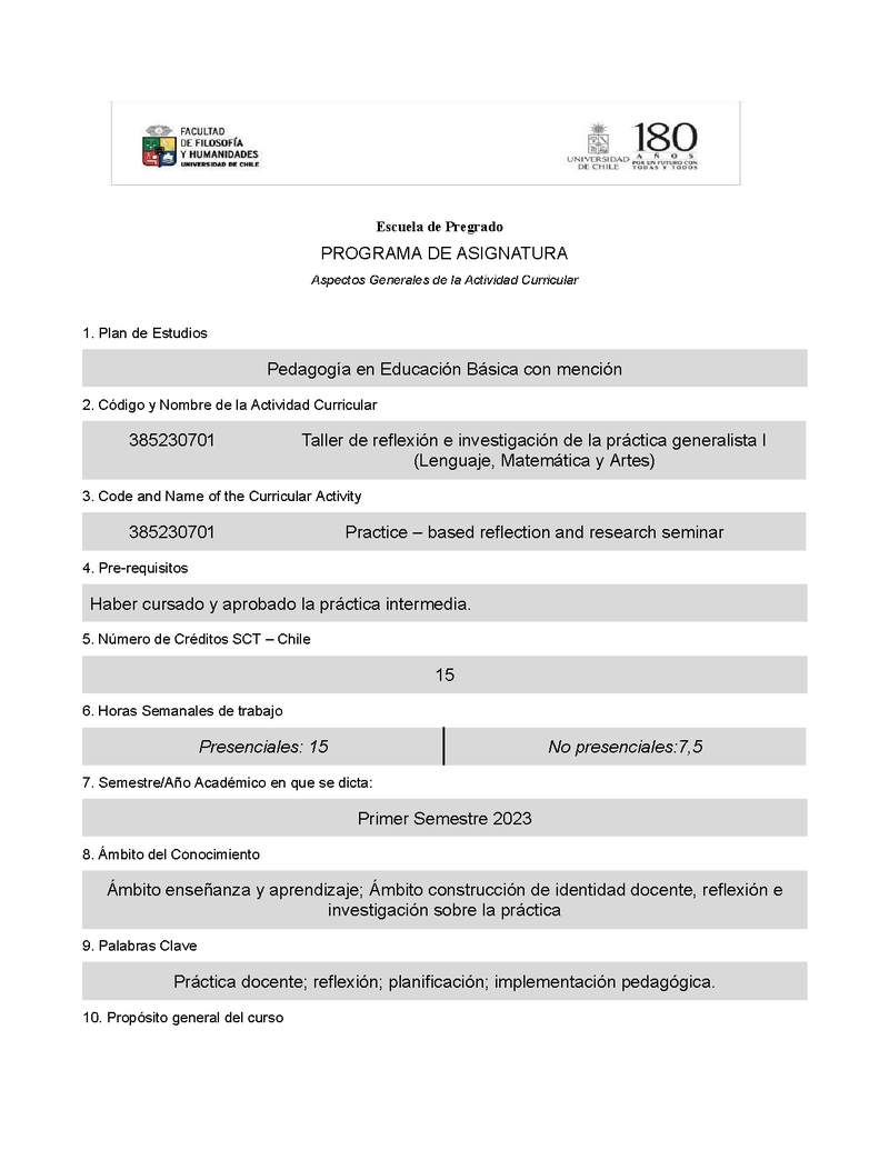 385230701-3 Taller de Reflexión/Investigación de la Práctica Generalista I: (Lenguaje, Matemática y Artes) 2023, Primer Semestre