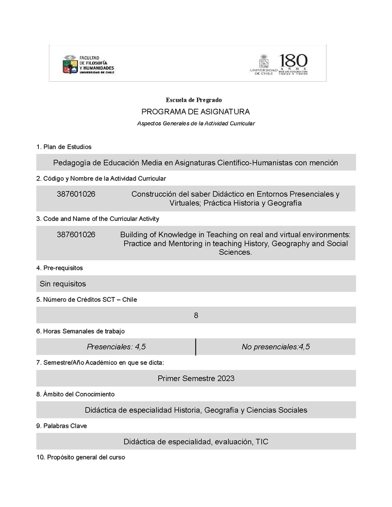 387601026-2 Construcción del saber Didáctico en Entornos Presenciales y Virtuales; Práctica Historia y Geografía 2023, Primer Semestre