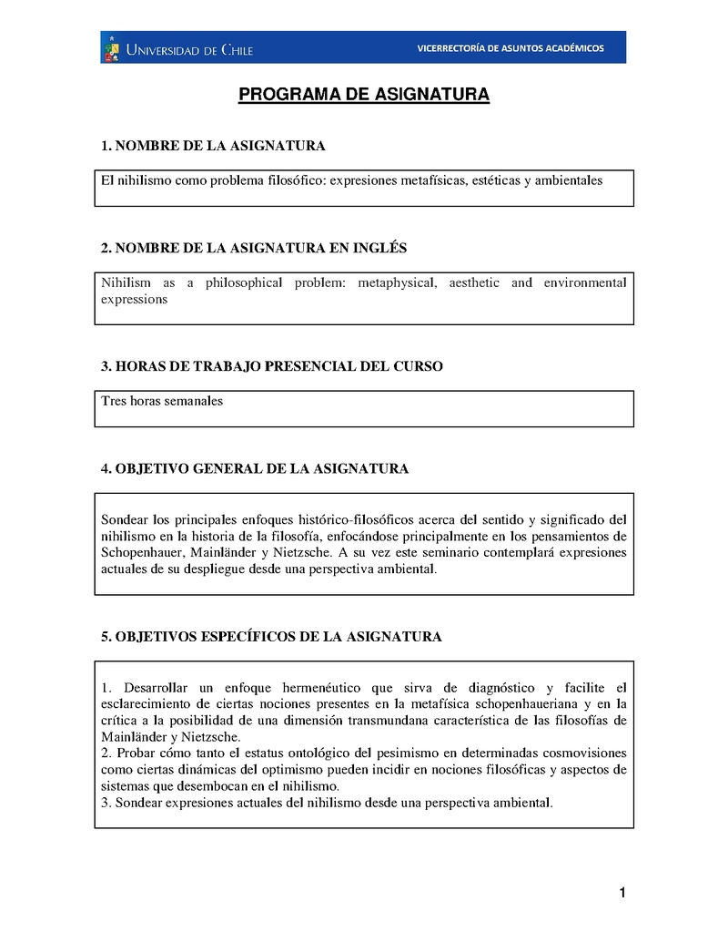 PS-FH-DFIL-0013-1 El nihilismo como problema filosófico: expresiones metafísicas, estéticas y ambientales. 2023, Primer Semestre