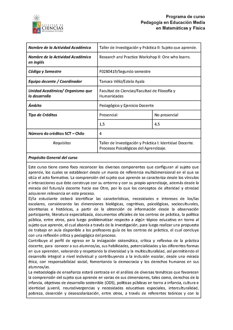F0280419-1 Taller de Investigación y Práctica Profesional II: Sujeto que aprende 2023, Segundo Semestre