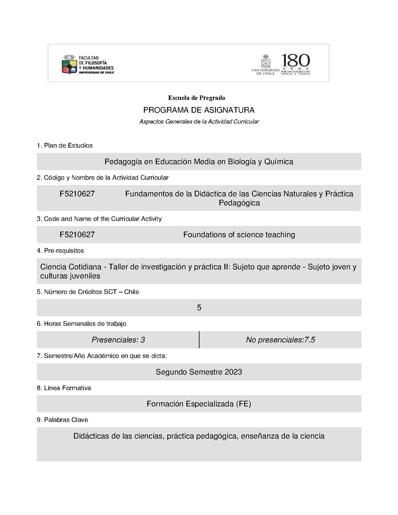 F5210627-1 Fundamentos de la Didáctica de las Ciencias Naturales y Práctica Pedagógica 2023, Segundo Semestre