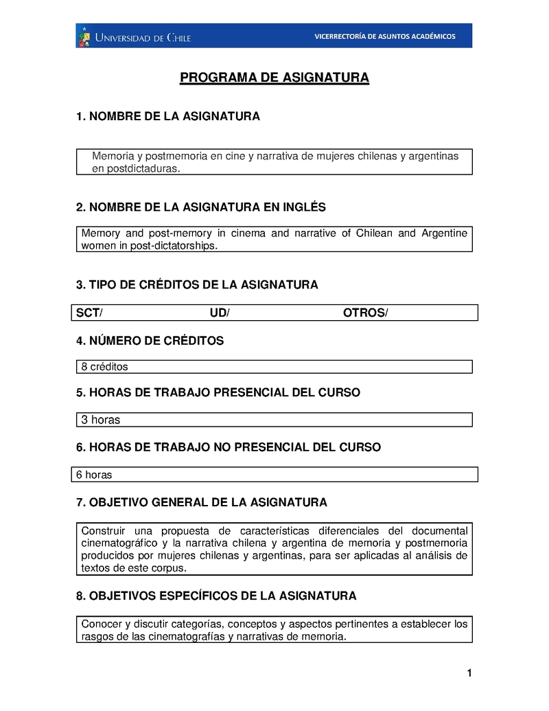 FH-DLIT-0009-1 Memoria y postmemoria en cine y narrativa de mujeres chilenas y argentinas en postdictaduras. 2023, Segundo Semestre