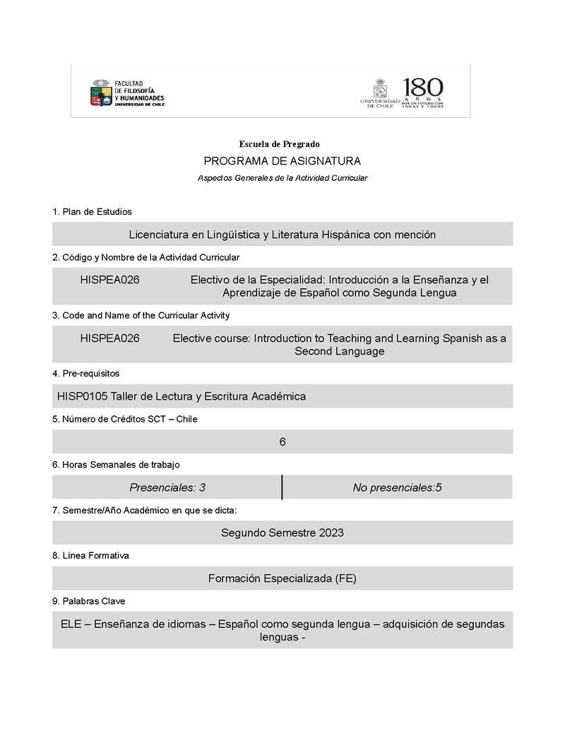 HISPEA026-1 Introducción a la enseñanza y el aprendizaje de español como segunda lengua 2023, Segundo Semestre