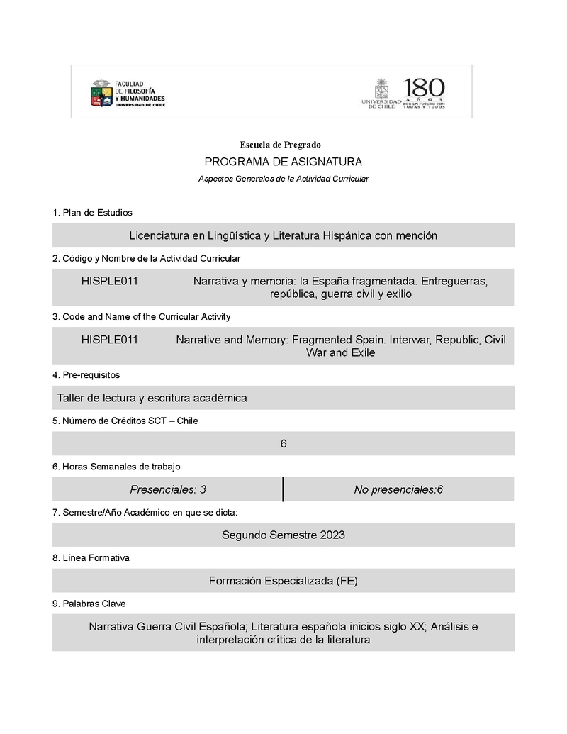 HISPLE011-1 Narrativa y Memoria: La España Fragmentada. Entreguerras, República, Guerra Civil y Exilio 2023, Segundo Semestre