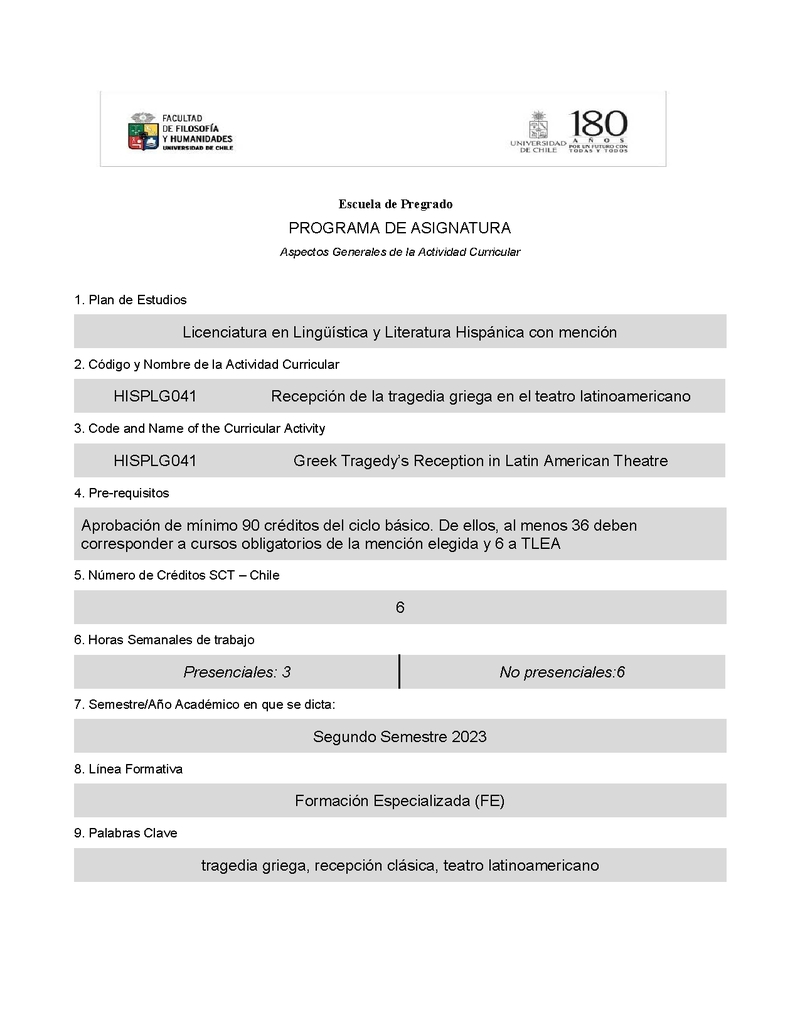 HISPLG041-1 Recepción de la tragedia Griega en el teatro latinoamericano 2023, Segundo Semestre