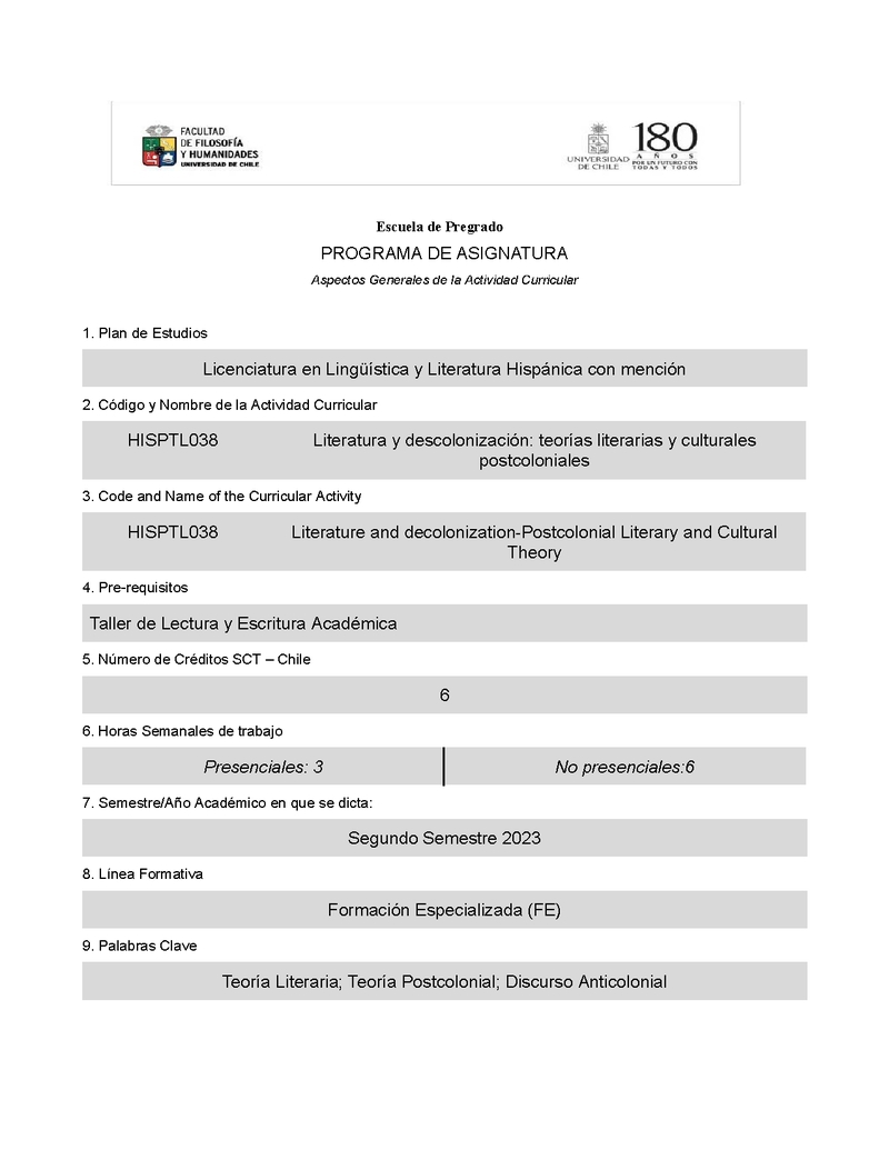 HISPTL038-1 Literatura y descolonización : teorías literarias y culturales postcoloniales 2023, Segundo Semestre