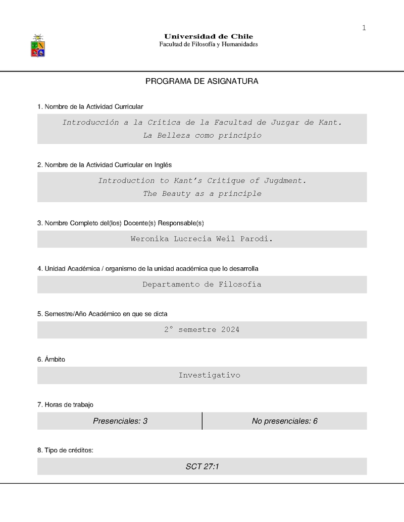 FILS223-1 Seminario Electivo: Introducción a la Crítica de la Facultad de Juzgar de Kant. La Belleza como principio 2024, Segundo Semestre