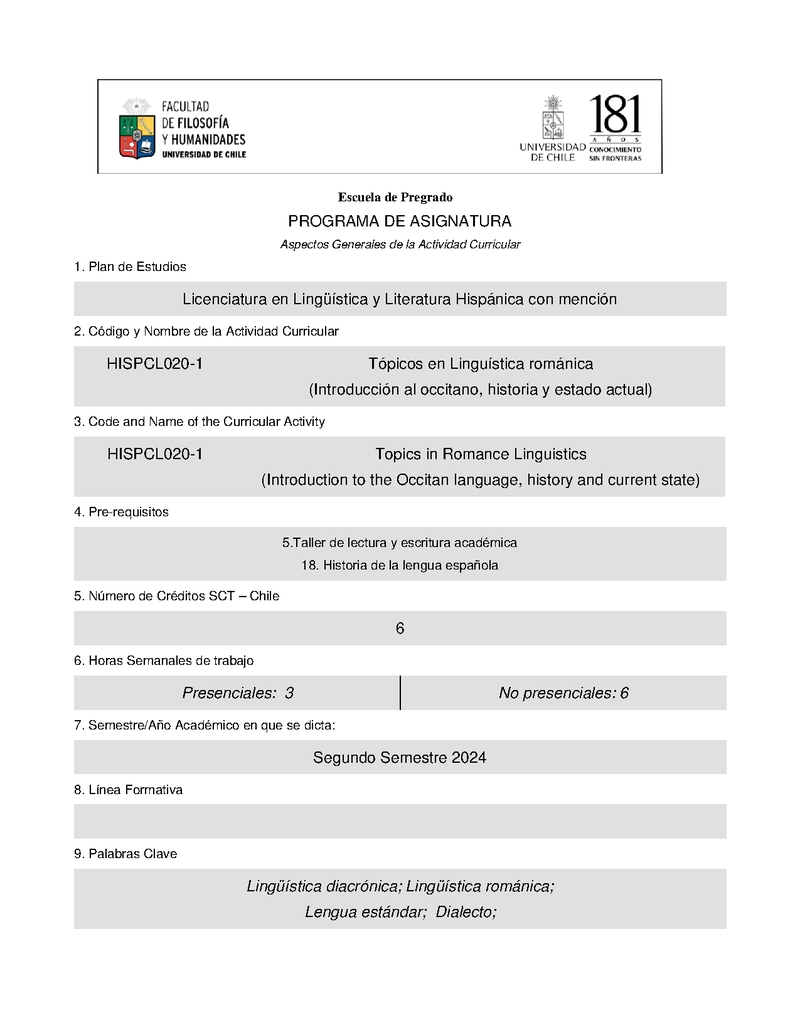 HISPEA038-1 Temas de Lingüística Románica: Introducción al Occitano, Historia y Estado Actual 2024, Segundo Semestre