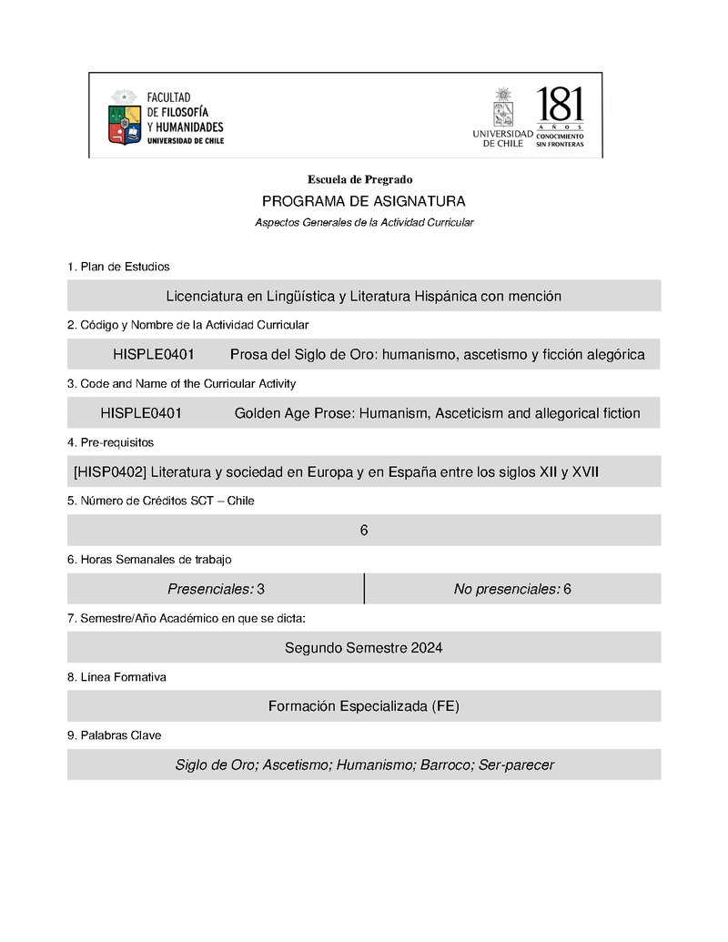 HISPLE041-1 Prosa del Siglo de Oro: Humanismo, Ascetismo y Ficción Alegórica 2024, Segundo Semestre