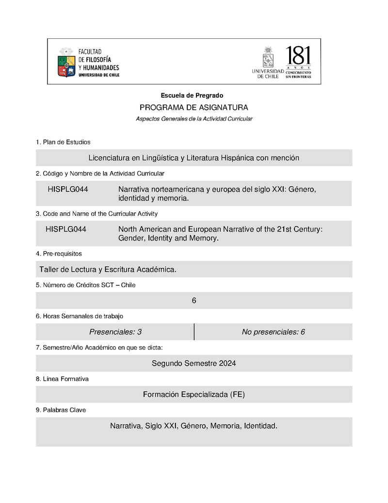 HISPLG048-1 Narrativa norteamericana y europea del siglo XXI: Género identidad y memoria 2024, Segundo Semestre