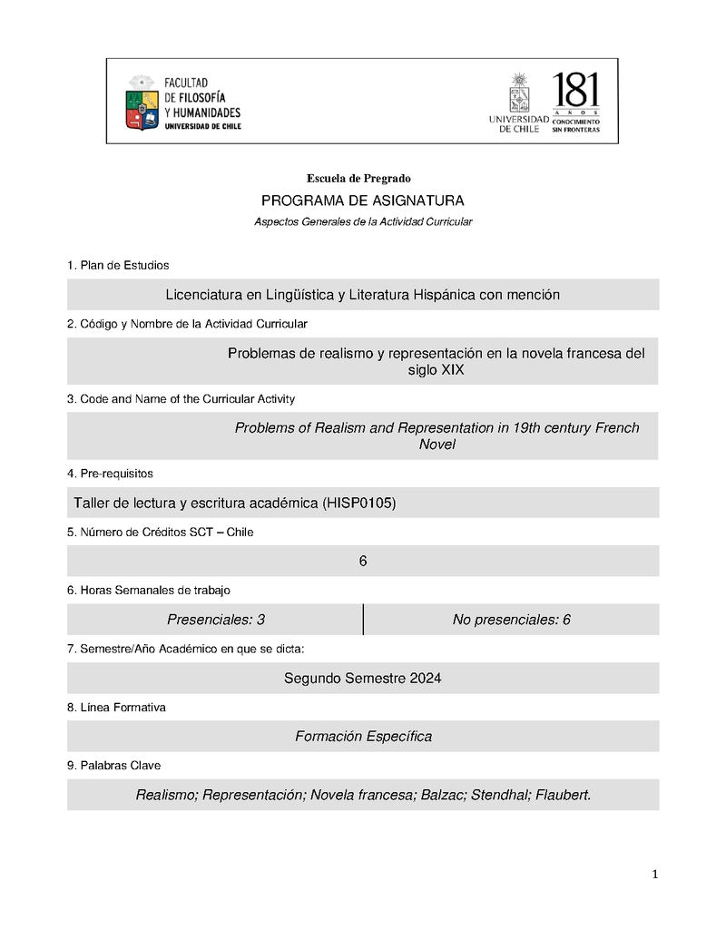 HISPLG049-1 Problemas de Realismo y Representación en la Novela Francesa del Siglo XIX 2024, Segundo Semestre