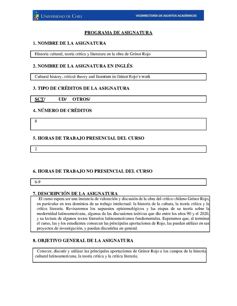 FH-DELA-022-1 Historia cultural, teoría crítica y literatura en la obra de Grínor Rojo 2025, Segundo Semestre