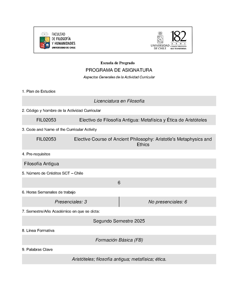 FIL02053-1 Electivo de Filosofía Antigua: Metafísica y Ética de Aristóteles 2025, Segundo Semestre