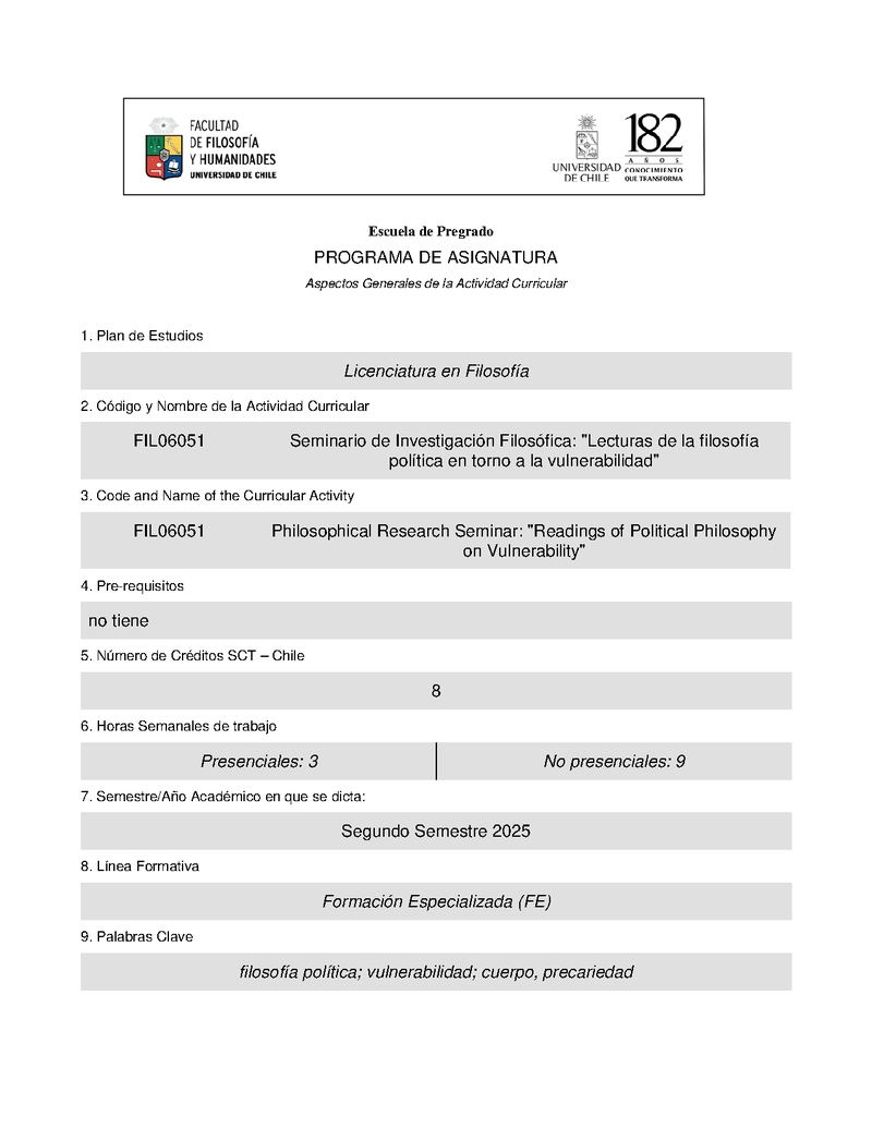 FIL06051-1 Seminario de Investigación Filosófica: "Lecturas de la filosofía política en torno a la vulnerabilidad" 2025, Segundo Semestre