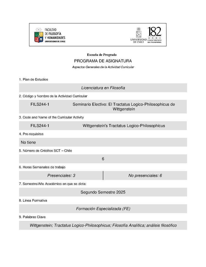 FILS244-1 Seminario Electivo: El Tractatus Logico-Philosophicus de Wittgenstein 2025, Segundo Semestre