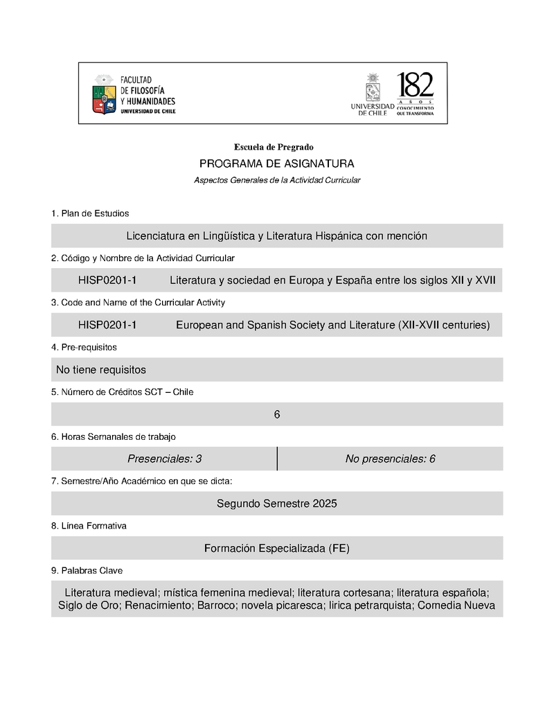 HISP0201-1 Literatura y Sociedad en Europa y España entre los siglos XII y XVII 2025, Segundo Semestre