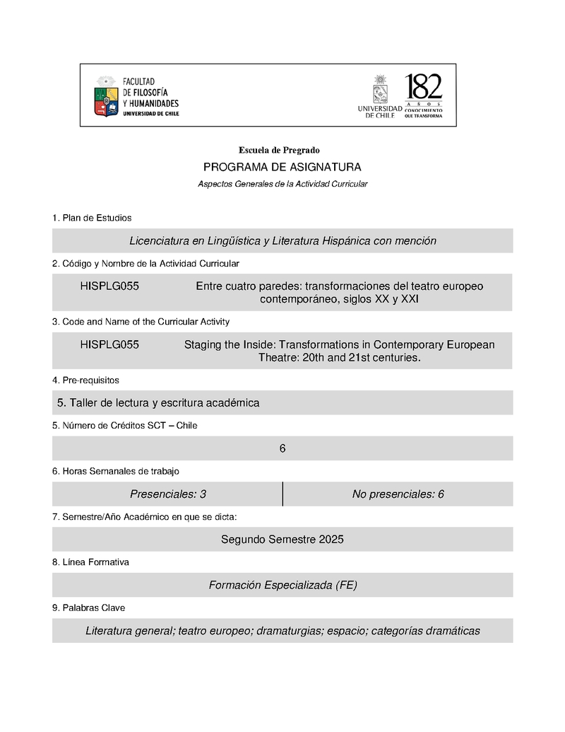 HISPLG055-1 Entre Cuatro Paredes: Transformaciones del Teatro Europeo Contemporáneo, Siglos XX y XXI 2025, Segundo Semestre