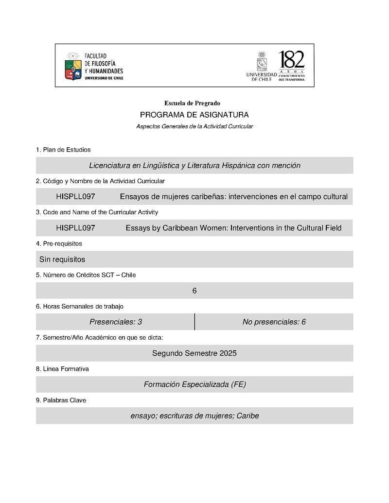 HISPLL097-1 Ensayos de mujeres caribeñas: intervenciones en el campo cultural 2025, Segundo Semestre