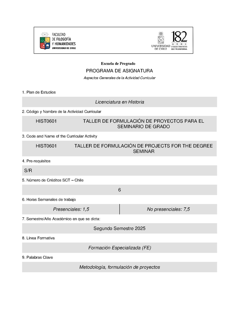 HIST0601-1 Taller de Formulación de Proyectos para el Seminario de Grado 2025, Segundo Semestre