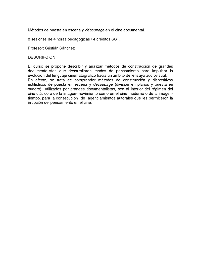 MCDE32-1 MCDE Taller de Autor: Métodos de Puesta en Escena y Découpage en el Cine Documental 2018, Primer Semestre