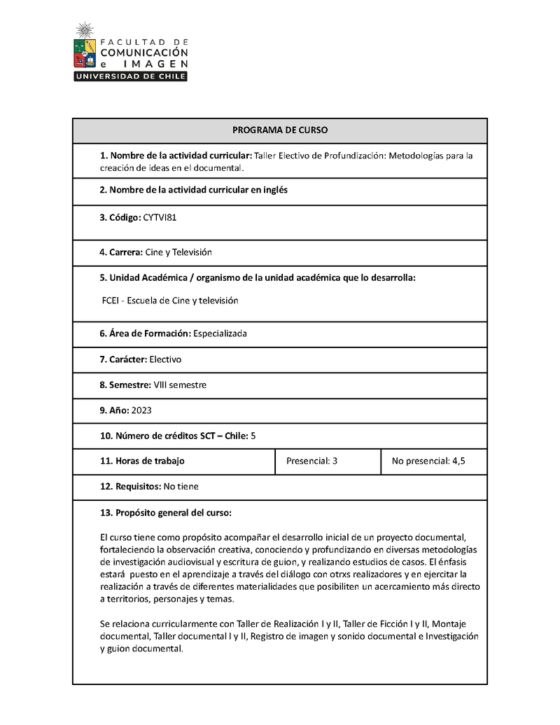 CYTVI81-1 Taller Electivo de Profundización: Transficciones y otras metodologías para la creación del documental 2023, Segundo Semestre