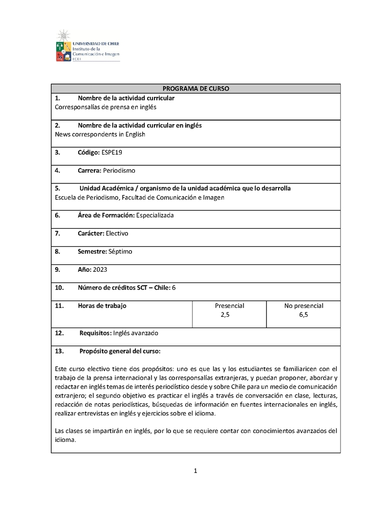 ESPE19-1 Electivo de Especialización: Corresponsalías de prensa en inglés 2024, Segundo Semestre