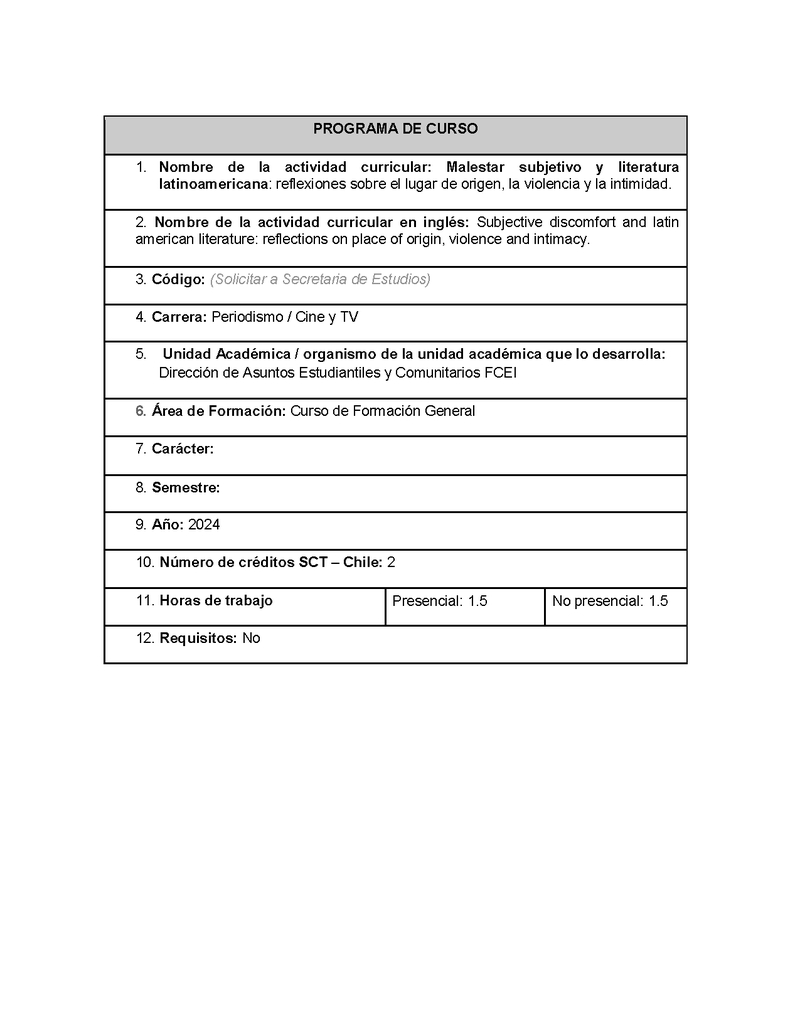 ICEICFG29-1 Curso de Formación General: Malestar subjetivo y literatura latinoamericana: reflexiones sobre el lugar de origen, la violencia y la intimidad. 2024, Segundo Semestre