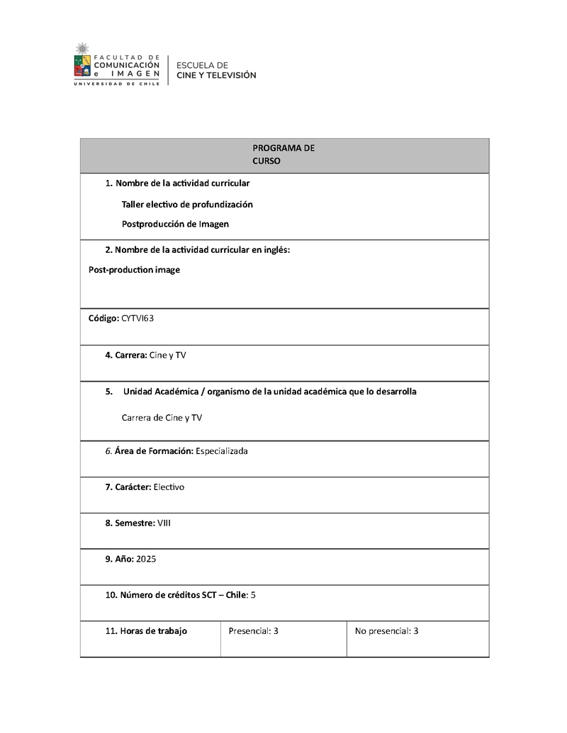 CYTVI63-1 Taller Electivo de Profundización: Post-producción de Imagen 2025, Segundo Semestre