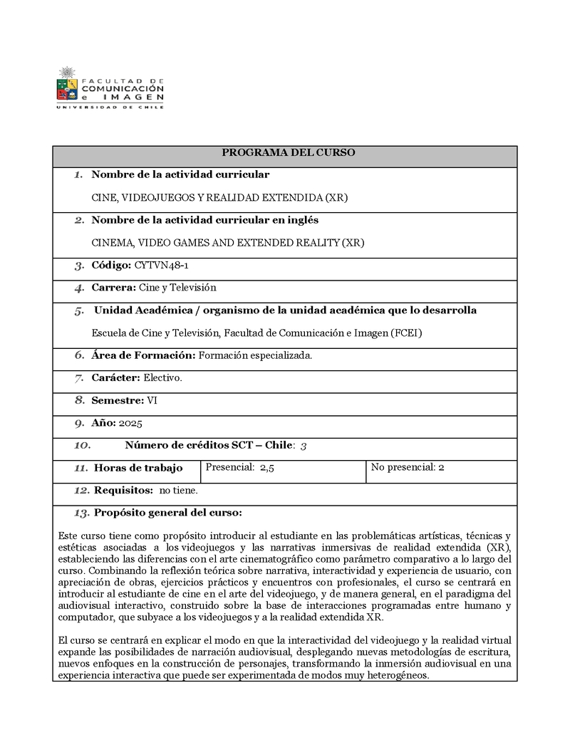 CYTVN58-1 Electivo de Formación Complementaria: Cine, Videojuegos, Realidad Extendida (XR) 2025, Segundo Semestre