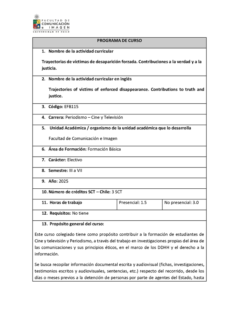 EFB115-1 Electivo de Formación Básica: Trayectorias de víctimas de desaparición forzada. Contribuciones a la verdad y justicia 2025, Segundo Semestre