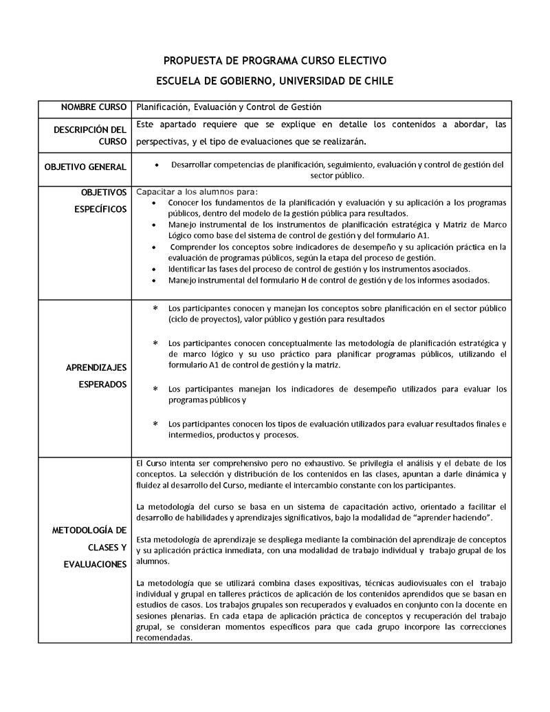 ELE771-1 Planificación, Evaluación y Control de Gestión de la Administración Pública 2016, Segundo Semestre