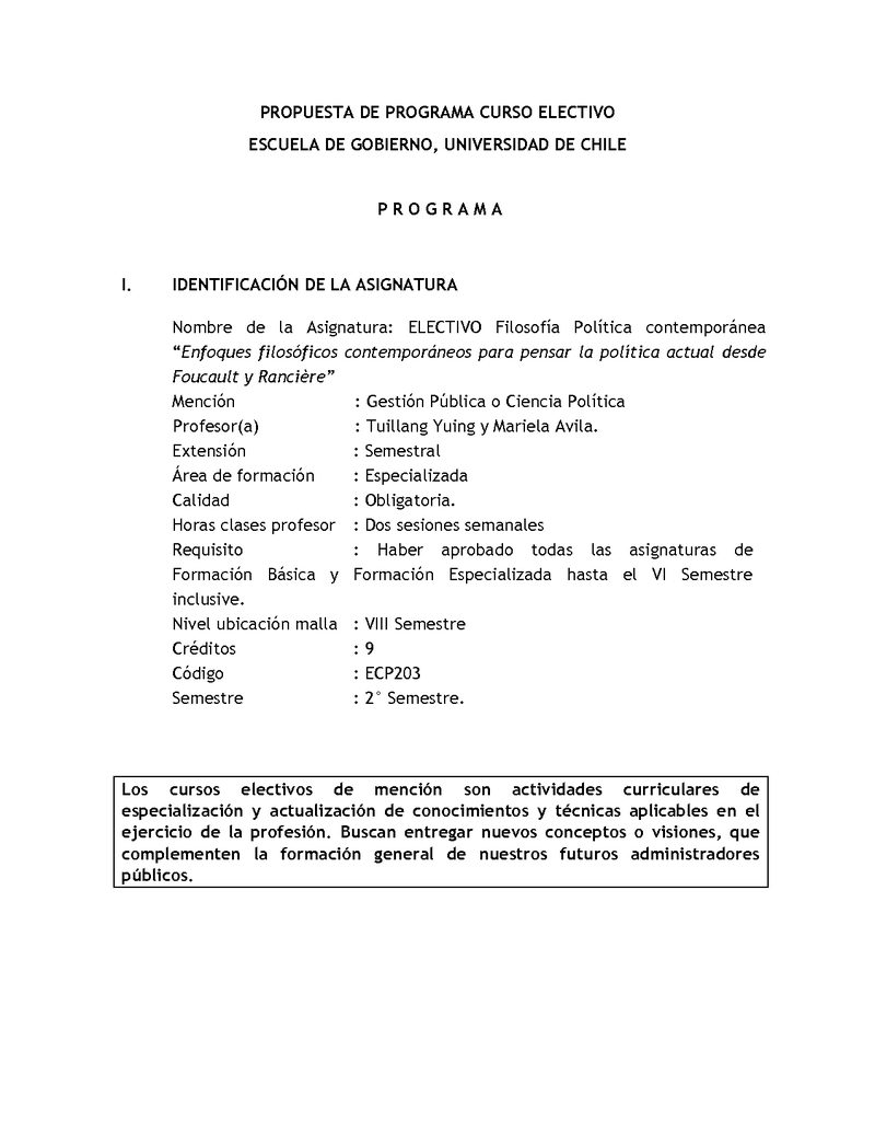 ELE777-1 Enfoques Filosóficos Contemporáneos para Pensar la Política Actual desde Foucault y Ranciere 2016, Segundo Semestre
