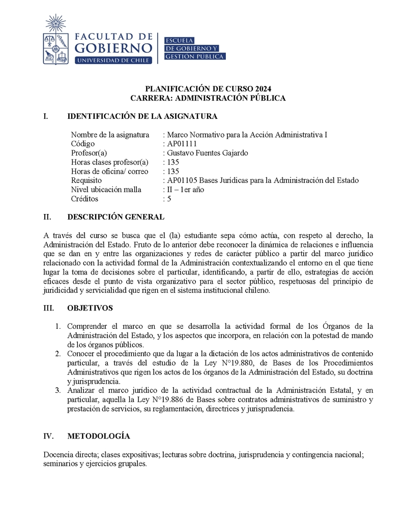 | Descripción | Planificación del curso Marco Normativo para la Acción Administrativa I, prof. Gustavo Fuentes Gajardo (II semestre 2024) | |