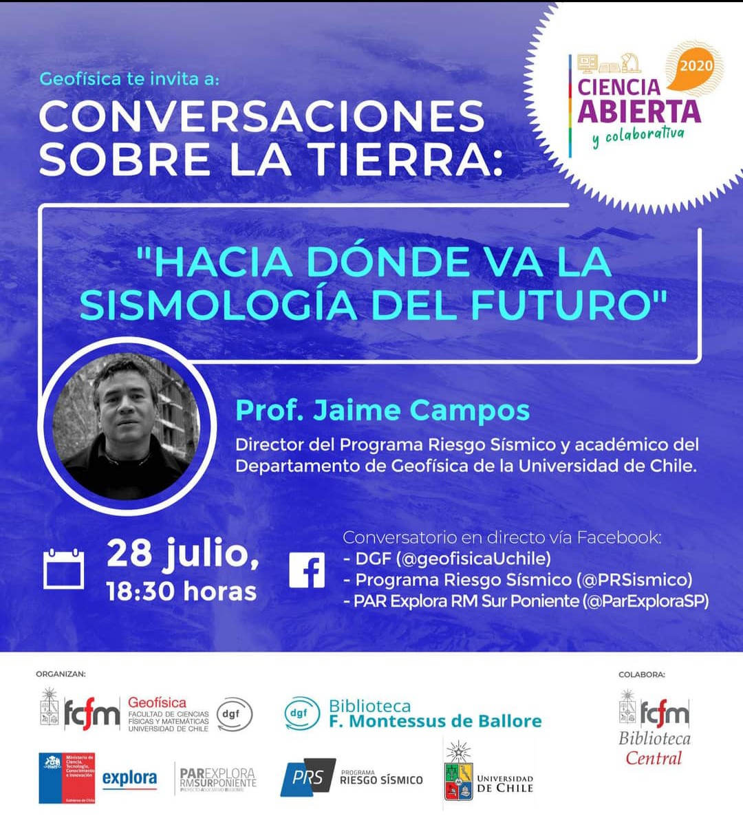 La Biblioteca de Geofísica tiene el agrado de invitarles al ciclo "Conversaciones sobre la Tierra" que comienza hoy a las 18:30 hrs., con la exposición del profesor Jaime Campos "Hacia dónde va la sismología del futuro". Este ciclo se realizará a través del facebook del DGF www.facebook.com/geofisicaUchile; ahí podrá interactuar a través del chat con sus comentarios y preguntas.