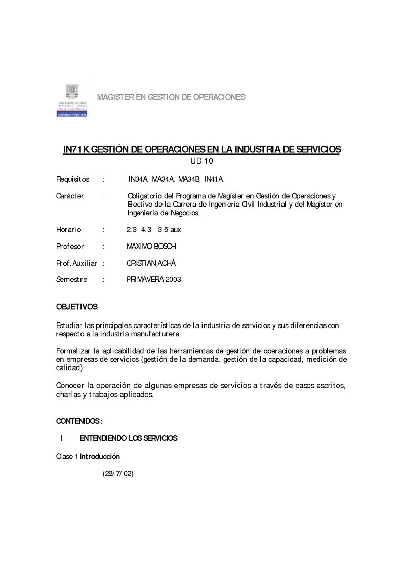 | Objetivos | Estudiar las principales características de la industria de servicios y sus diferencias con respecto a la industria manufacturera. Formalizar la aplicabilidad de las herramientas de gestión de operaciones a problemas en empresas de servicios (gestión de la demanda, gestión de la capacidad, medición de calidad). Conocer la operación de algunas empresas de servicios a través de casos escritos, charlas y trabajos aplicados. |