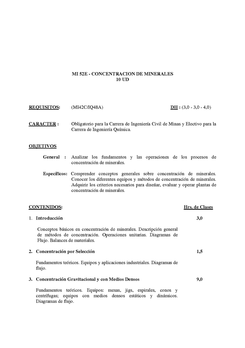 | Objetivos | Analizar los fundamentos y las operaciones de los procesos de concentración de minerales: Comprender conceptos generales sobre concentración de minerales. Conocer los diferentes equipos y métodos de concentración de minerales. Adquirir los criterios necesarios para diseñar, evaluar y operar plantas de concentración de minerales. |