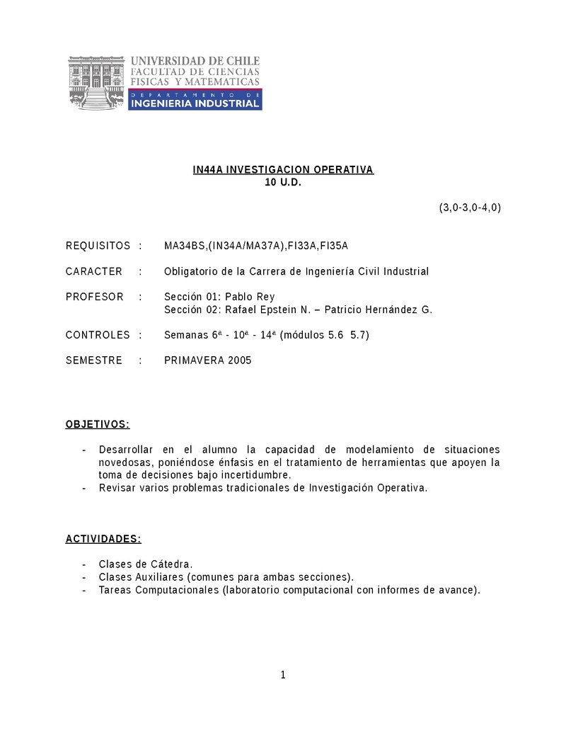 Comentarios BIBLIOGRAFÍA: Apuntes -R. Caldentey y S. Mondschein, Modelos de Decisión en Ambientes Inciertos. Apuntes Docentes para el Curso Investigación Operativa, IN44A. Departamento de Ingeniería Industrial, 1999. Disponibles en página web del curso. El desarrollo de las clases de cátedra se basa principalmente en estas notas. Libros básicos -H.A. Taha, Investigación de operaciones: una introducción, Alfaomega, México, 1989. -F. Hillier y G.J. Lieberman, Introduction to operations research, Holden-Day, Oakland,1986. -W. Winston, Operations research: applications and algorithms, Duxbury Press, Belmont, 1994. Estos libros tratan parte de la materia a un nivel más básico que el del curso. Se los recomienda como material introductorio y como fuente de ejercicios simples sobre los temas tratados. Hay traducción al castellano de los libros de Winston y Hillier y Lieberman. Libros avanzados -S. Ross, Introduction to probability models, Academic Press, Boston, 1993. Complemento de los apuntes. -S. Ross, Stochastic proceses, Wiley, New York, 1996. Cubre materias similares al libro anterior con un enfoque ligeramente más matemático. -F. Kelly, Reversibility and stochastic networks, Wiley, Chichester, 1979. Libro avanzado sobre redes de colas. El primer capítulo contiene una revisión sobre cadenas de Markov. Este libro se encuentra disponible en el sitio www.statslab.cam.ac.uk/~frank/rsn.html. -S. Ross, Simulación, Prentice-Hall, México,1999.