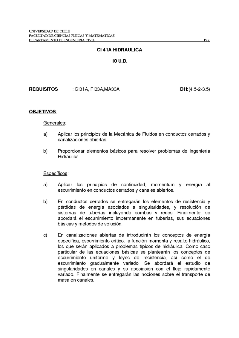 | Objetivos | Generales: a) Aplicar los principios de la Mecánica de Fluidos al estudio del flujo en conductos cerrados y canalizaciones abiertas. b) Proporcionar elementos básicos para resolver problemas de Ingeniería Hidráulica. Específicos: a) Aplicar los principios de continuidad, momentum y energía al escurrimiento en conductos cerrados y canales abiertos. b) En conductos cerrados se entregarán los elementos relativos a resistencia hidráulica pérdidas de energía asociados a singularidades, y resolución de sistemas de tuberías incluyendo bombas y redes. Finalmente, se abordará el escurrimiento impermanente en tuberías, sus ecuaciones básicas y métodos de solución. c) En canalizaciones abiertas se introducirán los conceptos de energía específica, escurrimiento crítico, la función momenta y resalto hidráulico, los que serán aplicados a problemas típicos de hidráulica. Como caso particular de las ecuaciones básicas se plantearán los conceptos de escurrimiento uniforme y leyes de resistencia, así como el de escurrimiento gradualmente variado. Se abordará el estudio de singularidades en canales y su asociación con el flujo rápidamente variado. |