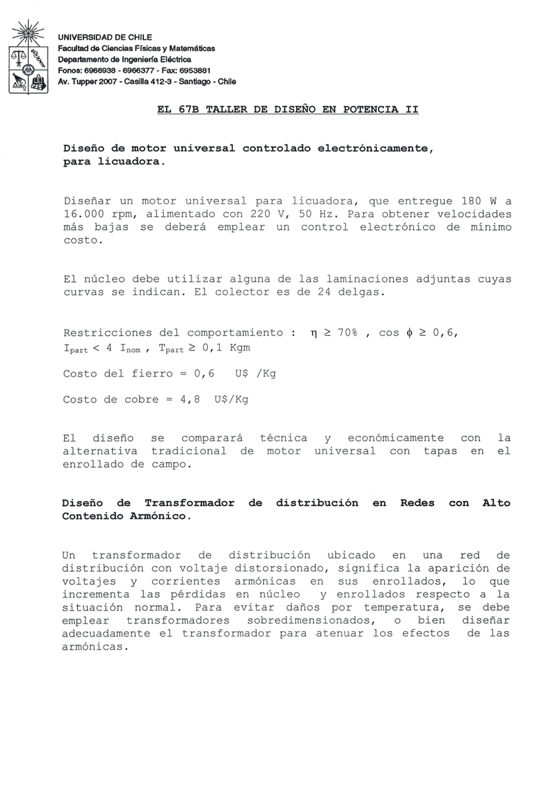 | Objetivos | Desarrollar en el futuro Ingeniero, las condiciones necesarias para abocarse al tratamiento de un problema de diseño, aunque no sea especialista del mismo, buscando los recursos necesarios para resolverlo y entregar la solución de ingeniería necesaria. El Taller contribuye a que el alumno tenga contacto con el mundo de la ingeniería, la que no es una ciencia exacta y para llegar a resultados en cada disciplina, emplea las matemáticas y la computación como herramientas. Es así que se deja de ver que todo es analítico con resultados perfectos y deben dejar entonces de tenerle temor a los números, entendiendo que los resultados de un diseño deben ser numéricos. A diferencia de los cursos que tienen por finalidad entregar materias de disciplinas básicas de la ingeniería eléctrica, este curso de Taller de Diseño se basa en métodos que han sido desarrollados a partir de esas disciplinas básicas, para efectuar el diseño de un equipo eléctrico. Es una disciplina profesional de la ingeniería, por lo cual no hay que esperar que todo sea presentado análiticamente con demostraciones como a las que estamos acostumbrados, con variables representadas sólo por letras y sin asignar valores numéricos. Aquí es imprescindible no tenerle miedo a los números y ponerle valores a las variables, para así dimensionar los elementos. Pues, en diseño, es imprescindible dar todas las dimensiones para que el equipo pueda ser después construido, que es la finalidad última, permitir que el equipo diseñado sea fabricado. |