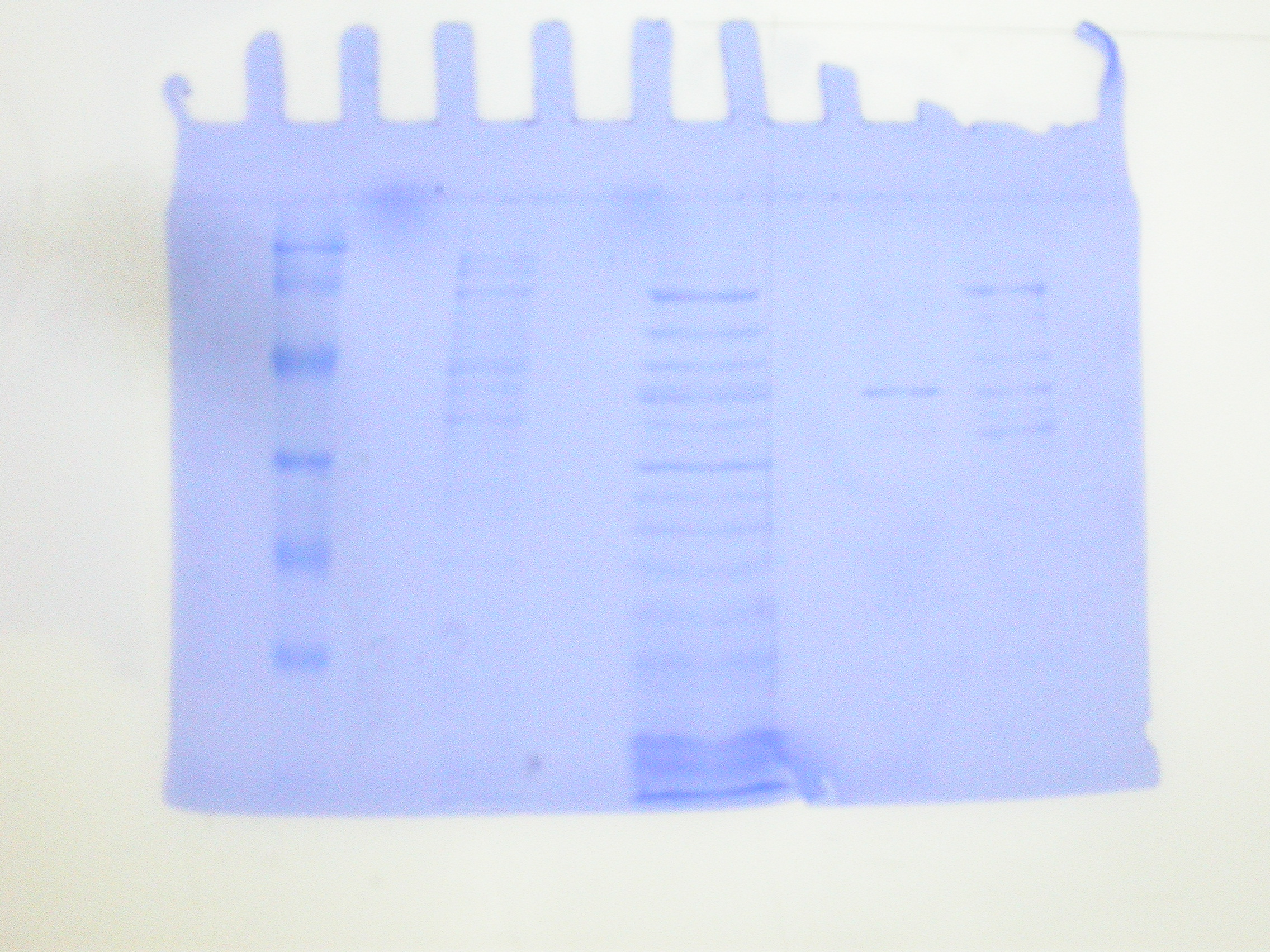 Descripción | Gel de acrilamida: Marcador PM, carril libre, sobrenadante de cultivo, carril libre, precipitado resuspendido, carril libre, pool grupo 1, pool grupo 2. PM: 117, 85, 48, 34, 26 y 19 KDa. |