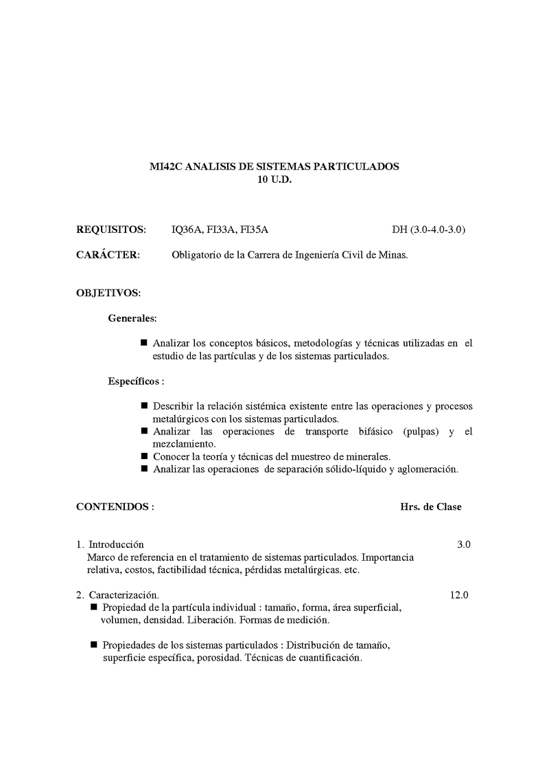 | Objetivos | Analizar los conceptos básicos, metodologías y técnicas utilizadas en el estudio de las partículas y los sistemas particulados. Conocer las operaciones de transporte y mezclamiento de pulpas, la teoría y técnicas del muestreo de minerales y las operaciones de separación sólido-líquido. Comprender y realizar balances de materiales. | |