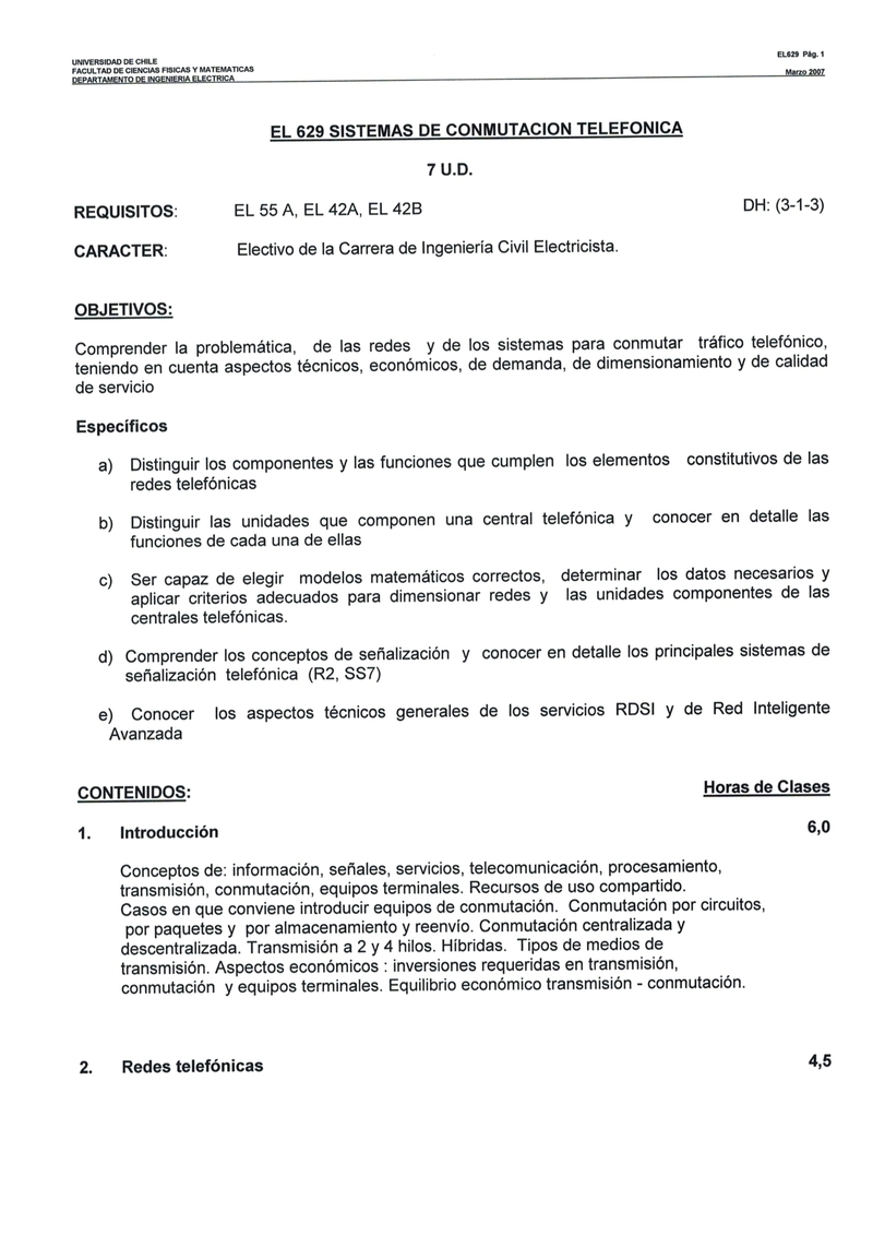 | Metodología | Clases de cátedra: martes y jueves Luis Castillo (martes en la mañana) Joachim Hintze (jueves en la mañana) Clases auxiliares: martes en la tarde La primera parte del curso se orienta a la descripción de los aspectos fundamentales de la telefonía. Posteriormente las clases de cátedra de los martes en la mañana se dedican exclusivamente a la telefonía IP, y las dos últimas clases a red inteligente avanzada y a NGN. En las posteriores clases de cátedra de los días jueves se profundiza el estudio de los conceptos en que se basa la conmutación de circuitos. |
