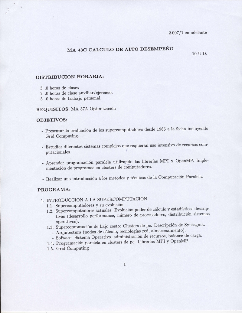 | Objetivos | El objetivo de este curso es enseñar los metodos mas importantes que permiten estudiar numericamente sistemas complejos. Debido a que el estudio numérico requiere el procesamiento eficiente de algoritmos y de grandes volúmenes de información se implementa en clusters de computadores utilizando las técnicas de la HPC (High Performance Computing). En la asignatura MA-43C estudiarán los siguientes temas: - Supercomputación y arquitecturas paralelas. - Programación paralela: MPI, OpenMP y GPU. - Implementación eficiente de algoritmos para estudio de sistemas complejos. - Topicos de computación paralela. |