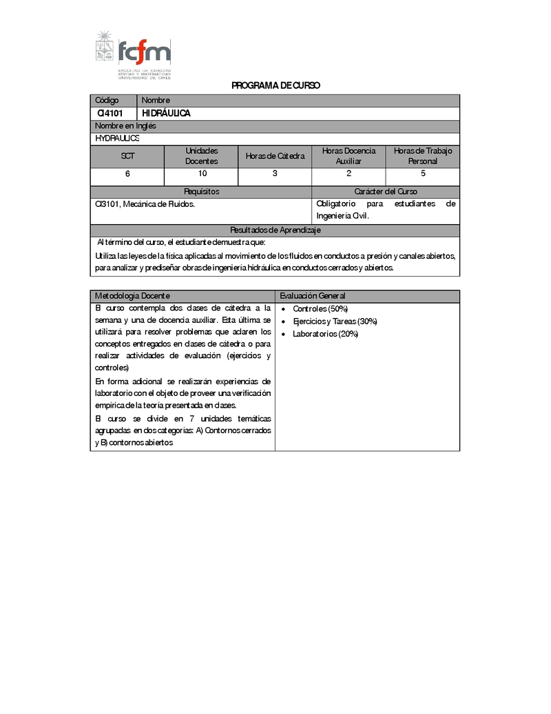 | Objetivos | Generales: a) Aplicar los principios de la Mecánica de Fluidos al estudio del flujo en conductos cerrados y canalizaciones abiertas. b) Proporcionar elementos básicos para resolver problemas de Ingeniería Hidráulica. Específicos: a) Aplicar los principios de continuidad, momentum y energía al escurrimiento en conductos cerrados y canales abiertos. b) En conductos cerrados se entregarán los elementos relativos a resistencia hidráulica pérdidas de energía asociados a singularidades, y resolución de sistemas de tuberías incluyendo bombas y redes. Finalmente, se abordará el escurrimiento impermanente en tuberías, sus ecuaciones básicas y métodos de solución. c) En canalizaciones abiertas se introducirán los conceptos de energía específica, escurrimiento crítico, la función momenta y resalto hidráulico, los que serán aplicados a problemas típicos de hidráulica. Como caso particular de las ecuaciones básicas se plantearán los conceptos de escurrimiento uniforme y leyes de resistencia, así como el de escurrimiento gradualmente variado. Se abordará el estudio de singularidades en canales y su asociación con el flujo rápidamente variado. |