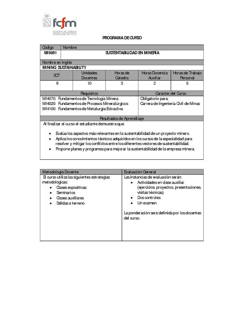 • Identifica, analiza y evalúa los aspectos más relevantes en la sustentabilidad de un proyecto minero.